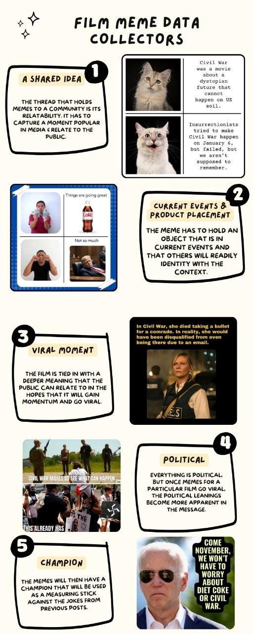 The film meme data collection community is made up of anyone that posts memes showcasing their thoughts or feelings with films and television as the basis for the communication. Whether you’re mentioning an episode of Friends or utilizing a photograph of a politician juxtaposed to the latest comedic film, media is being used to communicate globally through our screens. In this paper, I will review the existing literature on film memes and examine the schools of thought, such as entertainment leisure, to focus on what this community is about and how the LIS profession meets their needs. Within the film literature, I will look at historically, how films are used to pass messages, the political nature of films and discussion, and finally the habits of the community. With the methodology and discussion I hope to delve into how social media is a driving force of this community and that any progress to the technology is something that must be at the forefront and available for information professionals.