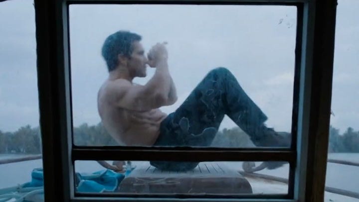 This is one of my favorite scenes in film. He’s working out to a fun, upbeat Cajun song while he stares out Key West. The viewer sees a beautiful man working out on the beach and finding himself. The protagonist is trying to find the will to live past the fact that he killed his opponent in the ring. It’s a lot of heavy stuff wrapped up In this beautiful package of a music montage scene and I’m here for it.