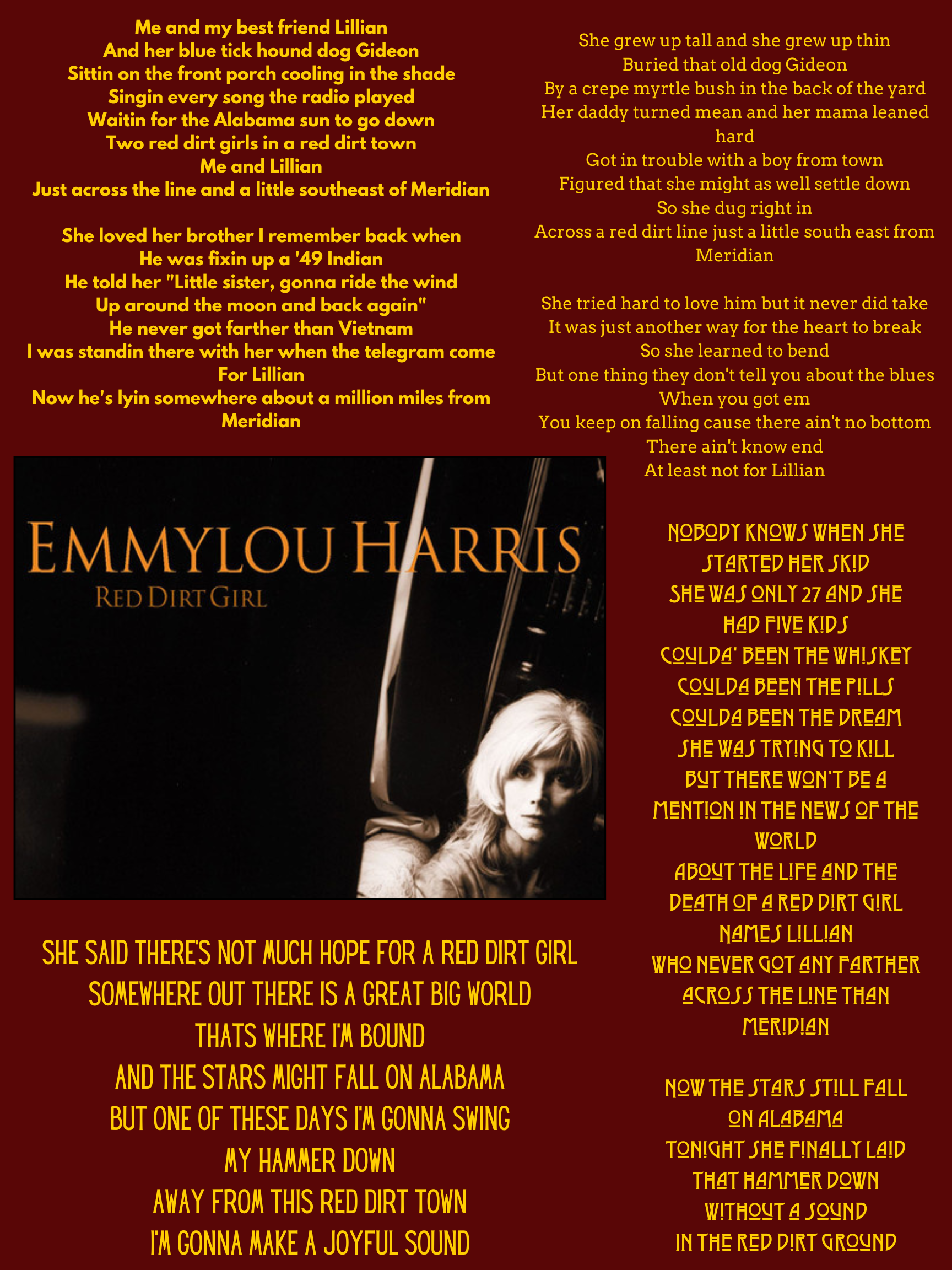Red Dirt Girl - Emmylou Harris Sabrina MonetMay 31, 2024ShareI’ve been on are.na all day and I experimented on a vinyl project. I’m putting the lyrics of my favorite song from the album along with the album cover. PreviousNext