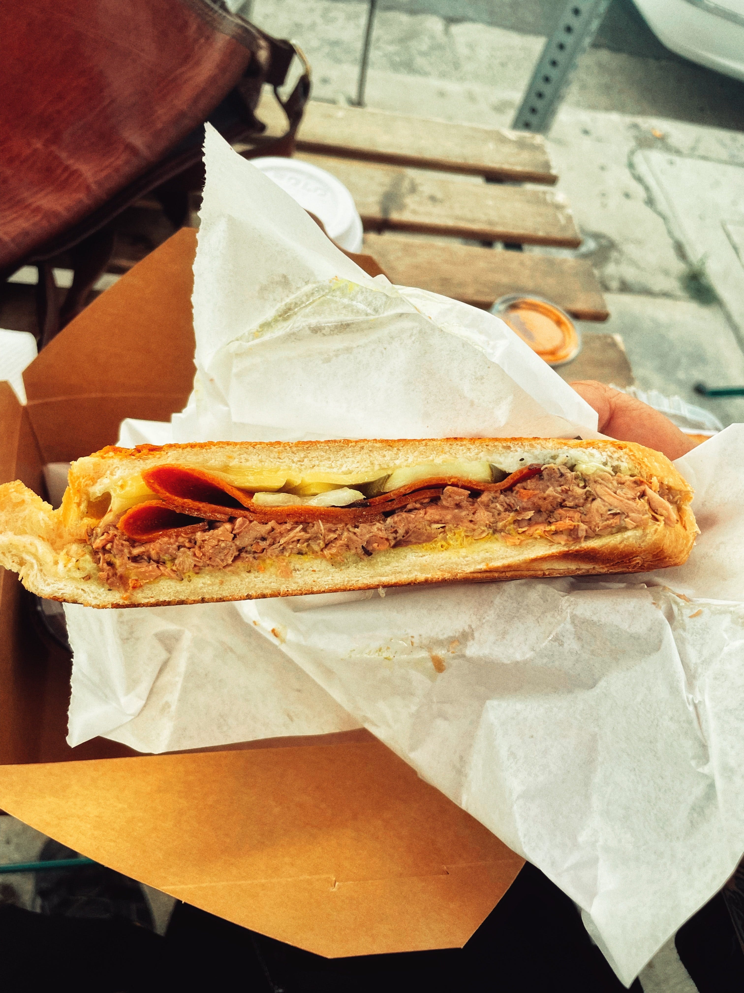 Vegan Cuban sandwich which had jack fruit, vegan cheese, vegan pepperoni, mustard, and pickles